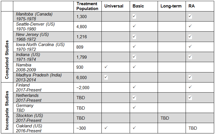 Notes: RA is random assignment. TBD is to be determined. This table was adapted from a table originally created by Give Directly, and updated by the authors to reflect data newly available on the studies in progress in Oakland, Stockton, and Finland, respectively.